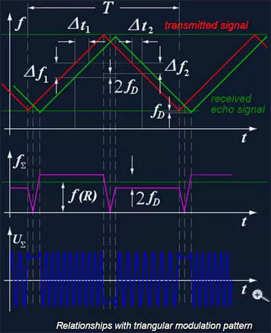如果没有多普勒频率,上升沿期间的频率差值等于下降沿期间的测量值。对于运动目标,则上升/下降沿期间的频率差不同,我们可以通过这二个频率差来测距和测速。